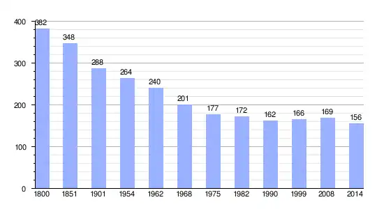 Los datos demográficos contemplados en este gráfico de la comuna de La Bazoge[4] se han cogido de 1800 a 1999 de la página francesa EHESS/Cassini, y los demás datos de la página del INSEE.[5]