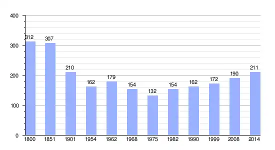 Los datos demográficos contemplados en este gráfico de la comuna de La Bigne[4] se han cogido de 1800 a 1999 de la página francesa EHESS/Cassini, y los demás datos de la página del INSEE.[5]