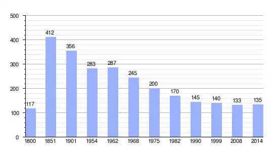 Los datos demográficos contemplados en este gráfico de la comuna de La Chapelle-Hullin[4] se han cogido de 1800 a 1999 de la página francesa EHESS/Cassini, y los demás datos de la página del INSEE.[5]