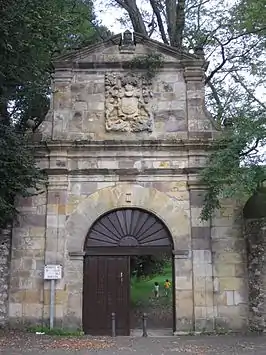 "Escudo cortado, el primero en campo de gules una venera de plata. El segundo en campo de azur, un puente de plata de tres arcos, sobre ondas de plata y azur. Al timbre la corona real de España".[1]