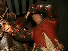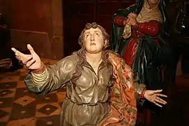 De 1,90 metros (una de las tallas más grandes del grupo junto con Longinos y el crucificado),[6]:p. 172 el mancebo muestra un rostro apenas visible debido a que se cubre la cara con la mano izquierda, mientras con la derecha sujeta las riendas del caballo. De rostro juvenil, viste jubón de color granate con botonadura frontal y mangas abultadas en verde oscuro con acuchillado, camisa blanca que anecdóticamente sobresale por debajo del jubón,[5] calzones del mismo tono que las mangas también con acuchillado, botas en granate con envés dorado y sombrero a juego con los calzones y las mangas.