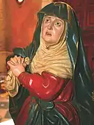 La Dolorosa es, junto con la Magdalena y San Juan, la que aporta carácter emocional a la obra. El dolor y la aflicción por la muerte de Cristo quedan patentes en su rostro, influenciado por imágenes como la Dolorosa de la Vera Cruz, pieza original del conjunto de Gregorio Fernández titulado El Descendimiento, y la talla de Santa Teresa emplazada en la Iglesia de Nuestra Señora del Carmen Extramuros, del mismo autor.[5] Con la vista dirigida hacia el cadáver de su hijo, el sufrimiento se acentúa gracias a una boca abierta, unas cejas arqueadas y unos pómulos enrojecidos. Ambos brazos están flexionados y desplazados al lado derecho, con las manos juntas y los dedos entrelazados aferrando un pañuelo. La figura muestra una leve torsión hacia la derecha, lo que permite resaltar la curvatura de algunos pliegues. La Virgen viste túnica bermellón de gruesos drapeados y ceñida a la cintura, toca blanca enmarcando el rostro y cubriendo parte del tórax, y un manto azul el cual cae desde la cabeza hasta los pies, mostrando un artístico recogido al estar sujeto al cíngulo que ciñe la túnica, lo que produce una cascada de pliegues curvilíneos al estilo de la talla de Santa Teresa de Fernández conservada en el Museo Nacional de Escultura.