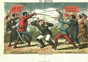 Por su parte, La Fé sostenía que Cándido Nocedal, un recién llegado al carlismo, no podía erigirse en director de la prensa católico-monárquica,[9] y acusaría a El Siglo Futuro de estar matando al carlismo al pretender convertirlo en obstáculo y rémora para la Iglesia en España y en juez y señor de los obispos y hasta del mismo papa León XIII.[10] En diciembre de 1882 el pontífice romano llegaría a intervenir en la disputa de la prensa católica española publicando una carta encíclica, Cum multa, en la que afirmó que no era posible identificar a la Iglesia con un partido político concreto.