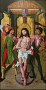 Dos ángeles arrodillados a los pies de Cristo son responsables de la recogida de su sangre mientras otro le seca la frente. [17] La presencia de los ángeles no es común en escenas de este tema y se puede relacionar con los que aparecen esporádicamente en la crucifixión. De hecho, la flagelación se ha considerado a menudo como la prefiguración de esta escena. [18]