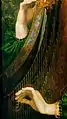 Muestra a la Dama de las Guirnaldas vestida de verde sentada entre el follaje dorado de un árbol de espinas y un bosquecillo; sus manos están extrayendo música de un arpa junto a su asiento, y su rostro prueba que su alma está absorta en la música que produce. A cada lado, sobre los hombros, un ángel mira por entre las brillantes hojas superiores del bosquecillo, como si el mismo Cielo esperase su canción. Alrededor de la cima del arpa está colgada una guirnalda de rosas y madreselvas, las más dulces de las flores terrenales, y el cielo arriba, donde el día (...) está muriendo, insinúa en su calma, ardientes intensidades de una dulzura aún más lejana. La brisa del atardecer acaba de subir y comienza a levantar la luz de las telas sobre sus hombros. En color, este cuadro es principalmente un estudio de verde, entremezclado con azul en varias sombras - el acónito azul intenso que aparece en la base de la composición, el pájaro brillante que revolotea a través de los árboles, el dibujo del ala pintado en el instrumento, y el color desvaneciéndose en el cielo. Estos tonos están equilibrados por el bronce dorado del pelo de la dama y el arpa de color oscuro, un instrumento el cual es sólido, con cuerdas a cada lado.
