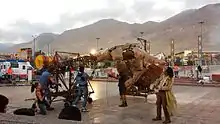 ![]() Gran Reyneta presentando su obra «El hombre venido de ninguna parte» en la Plaza Bicentenario de la República, Antofagasta. | ||