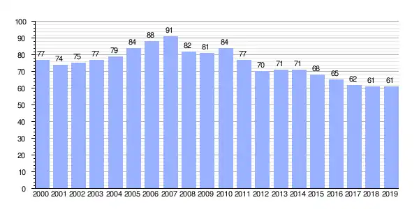 Gráfica de evolución demográfica de A Igrexa entre 2000 y 2019 |