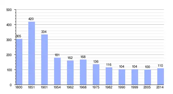 Los datos demográficos contemplados en este gráfico de la comuna de La Jemaye[4] se han cogido de 1800 a 1999 de la página francesa EHESS/Cassini, y los demás datos de la página del INSEE.[5]
