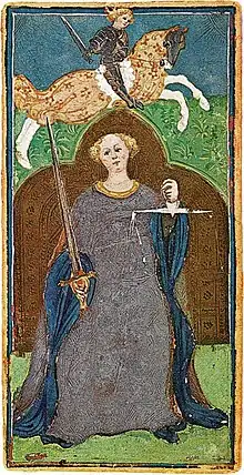 - Aparece una mujer sosteniendo en cada mano, una balanza y una espada de doble filo, la cual dirige al cielo (ver Justicia), con una corona en la cabeza.