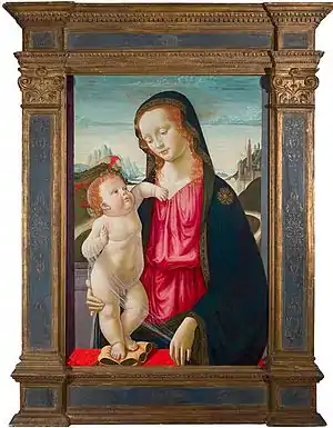 La obra fue realizada a partir de la obra homónima de su hermano Domenico que se encuentra en la Galería Nacional de Londres, Reino Unido, con el número de inventario 3937. Nos muestra a la Virgen vestida en azul y rojo, sosteniendo al Niño apoyado a su vez en un cojín de terciopelo.[1] En la versión de Domenico, un árbol se eleva a la izquierda de la composición en el punto donde termina el sinuoso camino que corre detrás de la Virgen.