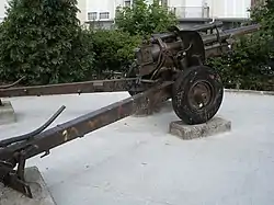 Un Obús 105/26 Reinosa, fabricado en la Naval desde 1943, expuesto en una calle de la localidad.