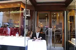 La fachada del local combina el granito negro revistiendo los muros, con amplias vidrieras, carpintería de madera y una puerta de dos hojas con vidrios esmerilados con la síntesis de una taza de café y su nombre[2]