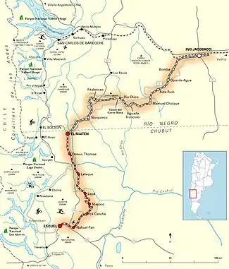 En 1908, el Gobierno de Argentina planeó una red de ferrocarriles a través de la Patagonia. Dos líneas principales unirían San Carlos de Bariloche en los Andes centrales con puertos marítimos de San Antonio Este en el Mar Argentino, y Puerto Deseado en la costa sureste. Se construyeron unos ramales para comunicar la línea central con el lago Buenos Aires (conectando Colonia Las Heras) y Comodoro Rivadavia (conectando Sarmiento). Colonia 16 de Octubre - Esquel y Trevelin - iba a ser conectado vía un ramal a Ingeniero Jacobacci. La red total comunicaría Buenos Aires vía San Antonio Este.