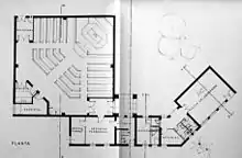 - La Vereda- Vista del edificio administrativo desde la zona porticada que abre a la plaza pequeña y de forma pentagonal.