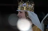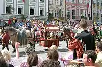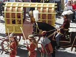 Novia Luis el Rico, padre del novio y organizador de la boda en una litera Músicos con instrumentos históricos Heraldo a caballo Caballero con armadura Damas de la nobleza Desfile Guardias ducales, reconocibles por el escudo de armas de la Casa de Wittelsbach Carruaje de la novia Lansquenetes formando un erizo de picas