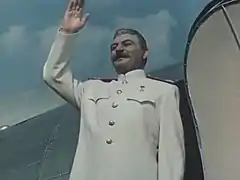 El culto a la personalidad de Stalin fue marginal durante la guerra.[2] Su persona solo apareció en dos películas,[3] pero tras la victoria de 1945, su culto se hizo más grande que nunca y fue bendecido como el arquitecto de la derrota de Alemania.[2]