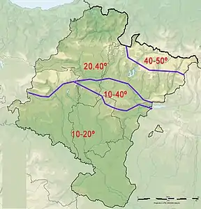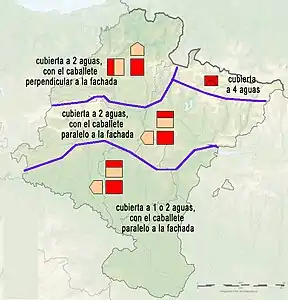 La inclinación de la cubierta aumenta con la humedad y el frío del clima. Una inclinación de entre 40º a 50º "se extiende en el norte de Navarra, desde Espinal a la frontera con Huesca, ocupando las altas tierras pirenaicas del curso superior de los ríos Urrobi, Irati, Salazar y Ezca" (p. 51). Entre 20º y 40º al oeste y el sur de esa zona, siendo su límite sur el río Ega hasta Estella, el Arga hasta Ibero continuando por Huarte hacia Urroz y Domeño.[6] Al sur de esta última zona aparece otra de transición con cubiertas de menor pendiente, con su límite meridional que pasa cerca de Belascoain, Tiebas, Aibar, Liedana y Yesa. En el resto de Navarra predominan cubiertas con inclinaciones enrre 10º y 20º.