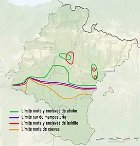 La casa de piedra es la habitual en la Montaña y en la Navarra Media, aunque el autor ha localizado en esta segunda zona enclaves de adobe y ladrillo. Al sur de esta zona, por tanto en la Ribera es habitual la fábrica de ladrillo. Se refiere también a la relativa abundancia de casas en cuevas en una zona bastante amplia, en la que lo más frecuente es el ladrillo: así existen viviendas en cuevas en Milagro (35%), Arguedas (27%), Andosilla (10%), Azagra (20%), Mendavia, Caparroso (20%), Peralta (20%).[7]