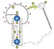 Así es como se transfiere la carga al terminal superior de un generador Van de Graaff. El terminal es una carcasa metálica hueca y funciona como un cubo de Faraday. La carga se transporta en su interior en una cinta móvil y luego se retira de la cinta mediante un alambre fijado en el interior del terminal. Dado que el interior del terminal tiene un potencial constante, la carga de la correa fluye hacia la superficie exterior, lo que se suma a la carga allí, independientemente de la cantidad de carga que ya se encuentre en el terminal.