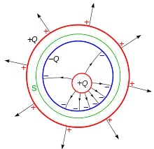 Las únicas cargas dentro de S son la carga Q en el objeto C, y la carga inducida Qinduced en la superficie interior del metal. Dado que la suma de estas dos cargas es cero, la carga inducida en la superficie interior del armazón debe tener un valor igual pero opuesto a la carga en C: Qinduced = -Q.