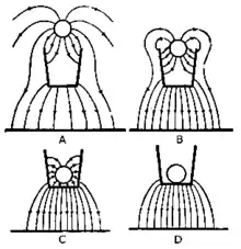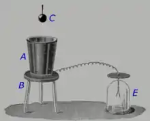 2.Un objeto metálico C (Faraday utilizó una bola de latón suspendida por un hilo de seda no conductor, pero los experimentos modernos a menudo utilizan una pequeña bola de metal o un disco montado en un mango aislante se carga con electricidad utilizando una máquina electrostática y se baja en el contenedor A sin tocarlo . A medida que baja, la lectura del detector de carga aumenta, indicando que el exterior del contenedor se está cargando. Una vez que el objeto está bien dentro del labio del contenedor, el detector de carga se nivela y registra una carga constante, incluso si el objeto se baja más. La carga en el exterior del contenedor tiene la misma polaridad que la del objeto. Si el detector de carga es tocado en la superficie interior del contenedor, se encuentra cargado con polaridad opuesta. Por ejemplo, si el objeto C tiene una carga positiva, se encontrará que el exterior del contenedor A tiene una carga positiva, mientras que el interior del contenedor tiene una carga negativa.