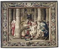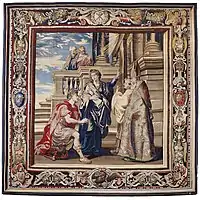 Este tapiz ilustra las concesiones en materia de impuestos instituidas por Constantino en favor de la Iglesia cristiana.[6]