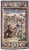El cuñado de Constantino y cogobernante fue derrotado dos veces por él por su empeño en continuar su persecución contra los cristianos, representando este tapiz la primera batalla, la cual tuvo lugar en un campo.[5]