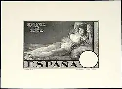 Los sellos de La maja desnuda se encargaron en Londres a la imprenta Waterlow & Sons de forma privada,[1] pero Correos, el servicio postal estatal de España, legitimó posteriormente esta emisión a cambio de una parte testimonial para destinarla a su circulación. Fueron emitidos con la intención recuperar los elevados costes de la reconstrucción de la Quinta de Goya,[11] un pabellón dedicado a la exhibición de las obras del pintor español, donde se expusieron algunas de sus obras y grabados.[12][13]