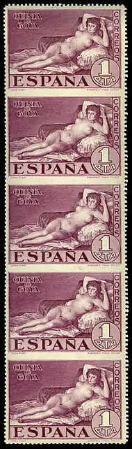 Las tres denominaciones restantes son las de mayor valor, de color violeta (1 peseta), pizarra (4 pesetas) y castaño (10 pesetas) (Edifil 513-515), grabados por José Luis López Sánchez-Toda, y que reproducen una de las pinturas más famosas y controvertidas del artista: La maja desnuda. El tamaño de estos tres sellos es de 47 × 34 mm,[7] —la serie de los retratos de Goya tiene un tamaño de 25 × 34 mm— el papel es blanco y carece de marcas de agua, tienen un dentado de 12½ (número de perforaciones cada dos cm). Las técnicas de impresión utilizadas son litografía (Edifil 499-504) y calcografía (Edifil 505-516).[7][8]