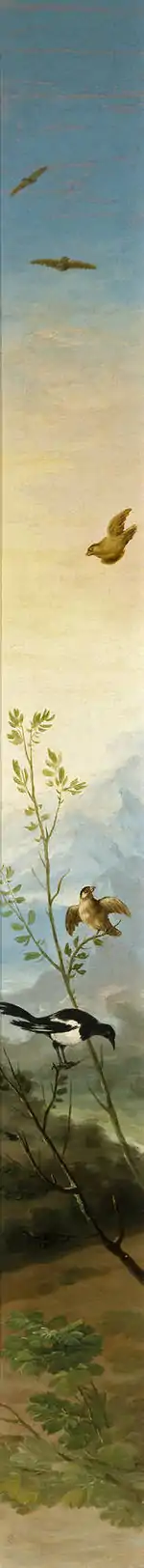Es posible que se haya inspirado en algún biombo chino, famosos en la centuria de Goya. En ellos se representaban animales exóticos sobre los árboles, sustituidos por el pintor por varios animales de la fauna de España, entre ellos una urraca.