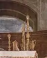 El espacio "actual" es la pantalla oscura que forma un coro de madera, del siglo XVI, que une ambas partes de la representación: sobre él las figuras, realmente presentes, destacan por un vivaz contraste de colores del mismo modo que en la parte inferior, invirtiendo la relación, destacan sobre el fondo vecino de mármol blanco de la grada.