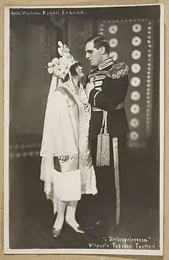 ![]() Los intérpretes fineses Irma Wikström y Kyösti Erämaa caracterizados en la opereta Sirkusprinsessa (Die Zirkusprinzessin) en el Arbetarteater de Víborg en 1926 o 1927 | ||