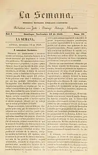 Deseamos que nuestro periódico sea una liza abierta a todos los talentos, así a; los que empiezan a manifestarse como a los que la edad i el estudio han madurado, donde todas las opiniones tengan cabida, todas las ideas encuentren la espresión de la publicidad, sin sujeción ni reticencias, con independencia i buena fé.Editorial del número 1 de La semana, 21 de mayo de 1859.[1]