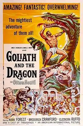 - En los Estados Unidos, la película fue distribuida por American International Pictures. En ese país, los derechos del nombre de Hércules estaban en posesión de la Universal, por lo que para ser estrenada allí hubo que cambiar el título de la película, que se distribuyó como Goliat y el dragón (Goliath and the Dragon). Se modificó mucho el montaje, y se incluyó una secuencia de paso de manivela con la que se representaba la lucha con el dragón a la que alude el título estadounidense.
