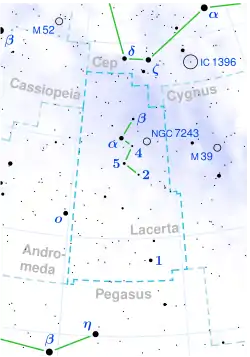 - Cúmulo abierto NGC 7243, con una extensión de 20 arcmin y magnitud 6,4 se encuentra a 2900 años luz.[18]