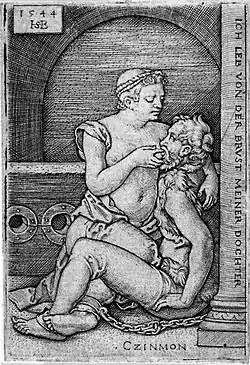 Existe una vieja historia llamada "Caridad romana"[18] Esta historia es conocida por mostrar a una joven mujer amamantando a un hombre mayor que se encuentra encarcelado. La historia proviene del escritor romano Valerio Máximo en el año 14. En 1362 la historia fue retocada por el famoso escritor Giovanni Boccaccio.[19] Después de Boccaccio se han realizado cientos o quizás miles de pinturas contando la historia. En un principio la historia relata un conflicto existente de tabú (implica incesto y amantamiento a un adulto) "o" salvando una vida para romper el tabú. En este aspecto no hay erotismo en la historia.