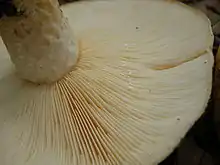 El píleo (el "sombrero" de la seta) mide de 8 a 20 cm de diámetro. Es inicialmente convexo pero luego se deprime en la región central, asumiendo la forma de un embudo en la madurez. Inicialmente, el borde del sombrero es encorvado hacia el interior, y se va levantando a medida que el sombrero aumenta de tamaño. La superficie del píleo es pegajosa y viscosa y próximo al margen hay una maraña de "pelo" justo debajo de la capa viscosa. El color de la superficie del sombrero es de color amarillo-ocre, a veces con bandas concéntricas de tonos más claros o más oscuros; el color se vuelve más pálido cerca de la orilla. Las láminas son adnatas (directamente relacionados con el tallo) la resultante (unidos al tronco y se extienden a lo largo de su longitud), estrechas e íntimamente cerca uno del otro. Bifurcadas cerca del tronco, las láminas son inicialmente incurvadas blanquecinas antes de convertirse en marrón-amarillo. Hay muchas lamélulas - pequeñas láminas que no se extienden completamente hasta el tronco.[3][4]