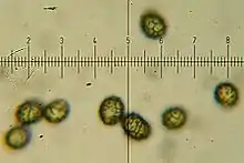 Las esporas miden de 7,5 a 10 por 6-8,5 micrómetro (µm), son elipsoides y ornamentado con verrugas y tiras estrechas que forman un retículo parcial.[3] Las partes prominentes de su superficie puede alcanzar hasta 1 micrón de altura, pero son principalmente en el rango de 0,3 a 0,6 µm.[6] Las esporas son hialinas (translúcidas) y amiloides, lo que significa que absorben el yodo cuando se tiñen con el reactivo de Melzer. Los basidios, las células portadores de esporas, cada uno tiene cuatro esporas y miden 37 a 48 de 8 a 11 micrómetros. La cutícula del sombrero es una ixocútis (la capa de tejido en la superficie de un hongo hecho de un hifas gelatinosas) formada por hifas incrustadas que alcanzan de 3 a 5 µm de extensión.[3]