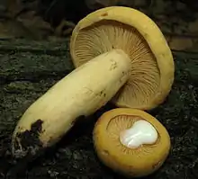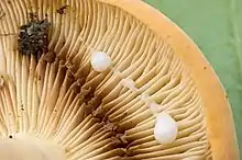 Las láminas son delgadas y frágiles, bifurcadas a veces y muy espaciadas entre sí. Por lo general, tiene un pálido color amarillo dorado y se convierten en marrón después de sufrir una agresión externa. Intercalados entre las laminillas están las lamélulas, extensiones cortas que no se extienden al tallo. La carne es de color blanquecino y dura. El olor de la seta es controvertido;[27] su olor es equivalente a un pescado muerto.[30] El olor es exhalado especialmente cuando los cuerpos fructíferos están secos. Una de las características más distintivas de la seta es la gran cantidad de látex, tan abundante que sólo un pequeño rasguño en las láminas es suficiente para hacer "llorar" una sustancia lechosa.[16] El látex tiende a manchar de marrón la superficie con la que entra en contacto.[30]