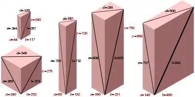 - Una arista, dos diagonales de cara y la diagonal espacial deben ser impares, una arista y la diagonal de la cara restante deben ser divisibles por 4, y la arista restante debe ser divisible por 16.