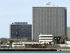 - Al oeste de Lafayette Plaisance, una losa en la esquina noroeste (norte de Lafayette) y un edificio similar en forma de losa compensado por una torre cuadrada en la esquina de Lafayette y Rivard.