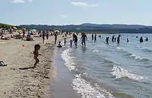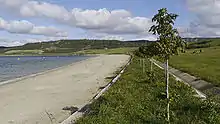 El lago cuenta con una playa artificial en la zona más próxima a la localidad, en forma de media luna y una extensión de 370 metros con zona verde y otra de arena, creada a partir de 90.000 toneladas de arena de cantera lavada. Con una temperatura media a lo largo de todo el año de 22 grados, es una de las grandes atracciones del lago.[1]
