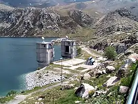 ![]() El lago Gento, con las cámaras de agua que enlazan con el embalse de Sallente. | ||