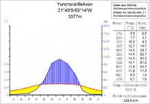 La temperatura media anual es de 11 °C y fluctúa solo levemente entre unos 6 °C en junio/julio y unos 14 °C de noviembre a marzo (ver diagrama climático Yunchará). La precipitación anual es de poco menos de 400 mm, con una estación seca pronunciada de abril a octubre con una precipitación mensual inferior a 15 mm, y un período de humedad de diciembre a febrero con 80 a 95 mm de precipitación mensual.