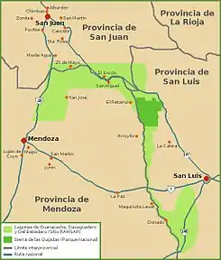 ![]() Esquema de ubicación del sitio Ramsar Lagunas de Guanacache, Desaguadero y del Bebedero. | ||