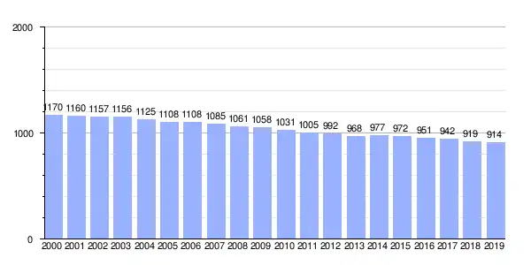 Gráfica de evolución demográfica de Laíño entre 2000 y 2019 |