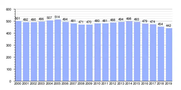 Gráfica de evolución demográfica de Lamas entre 2000 y 2019 |