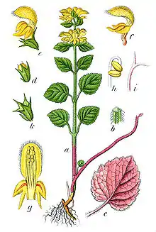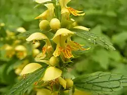 Lamium galeobdolon, (sinónimos Galeopsis galeobdolon, Lamiastrum galeobdolon o Galeobdolon luteum)[1] comúnmente conocido como ortiga muerta amarilla,[2] arcángel amarillo, planta de artillería, o planta de aluminio, es una planta con una flor silvestre muy extendida en Europa, y se ha introducido en otros lugares como planta de jardín. Se muestra la morfología de la flor de simetría bilateral, hojas opuestas y tallos cuadrados típica de la familia de la menta, Lamiaceae. Las flores son de color amarillo suave y en racimos axiales, con una capilla prominente (el lóbulo dorsal de la corola). Se propaga fácilmente y así se ha utilizado comúnmente como una cubierta vegetal ornamental. Puede ser invasivo en lugares donde no es nativo y se debe tener cuidado al momento de plantar en estas áreas.