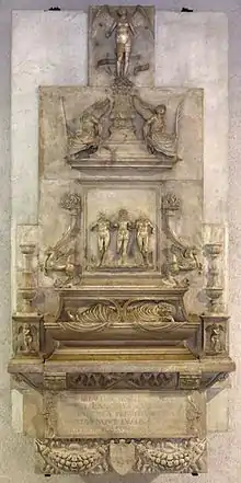 Su monumento funerario, inicialmente en el claustro del convento de San Marcos[7] y hoy trasladado al Castello Sforzesco, es obra de Agostino Busti (1513), e incluye un epigrama de Stefano Dolcino.[8][6]
