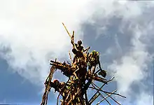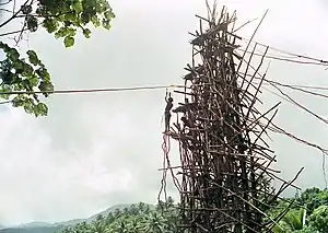 La construcción de la torre suele tardar entre 2 y 5 semanas.[2] Alrededor de 20 a 30 hombres ayudan a construirlo.[4] Los hombres cortan árboles para construir el cuerpo, limpian un sitio para la torre y quitan rocas del suelo.[4] La tierra se labra para ablandar la tierra.[2] La madera está recién cortada, para que se mantenga fuerte.[3] El núcleo de la torre está hecho de un árbol cortado y un andamio de postes atados con enredaderas que lo estabilizan.[8] Del frente de la torre salen varias plataformas a unos 2 metros, sostenidas por varios puntales.[8] La plataforma más baja mide alrededor de 10 metros y la plataforma más alta está cerca de la cima.[8] Durante el salto, los soportes de la plataforma se rompen, lo que hace que la plataforma se incline hacia abajo y absorba parte de la fuerza de la caída.[8]